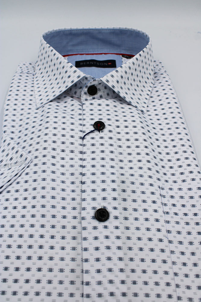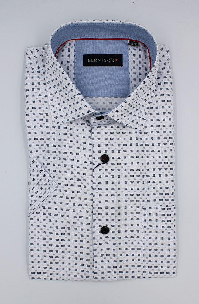 Lucifer skjorte fra Berntson. Skjorten har korte ærmer, Cut Away krave og en brystlomme. Mønstret er enkelt og ensartet i grå og sort på en hvid bundfarve i en elegant klassisk stil. Perfekt til et par jeans eller en habit.