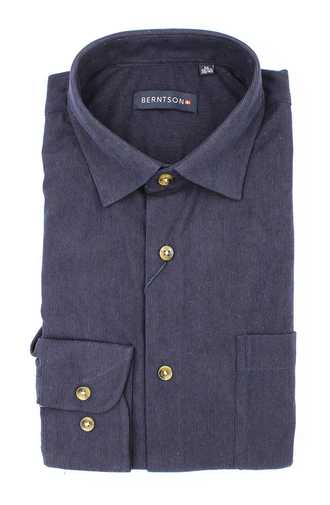 Corderoy fløjlsskjorte fra Berntson. Blød skjorte i fløjl med skjortekrave og brystlomme. Skøn skjorte uden en regulær knapstolpe, hvilket giver et flot look.