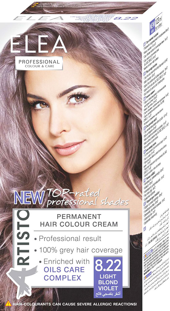 ELEA – Professionel Farve & Pleje – Permanent Hårfarve – 8.22 Light Blond Violet Indeholder: 1 par handsker 1 tube hårfarve med drueolie 60 ml 1 flaske hydrogenperoxid 60 ml 1 pakke oliebehandling 3 ml 1 pakke balsam med solsikkeolieekstrakt 15 ml